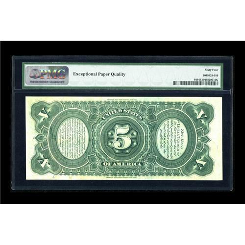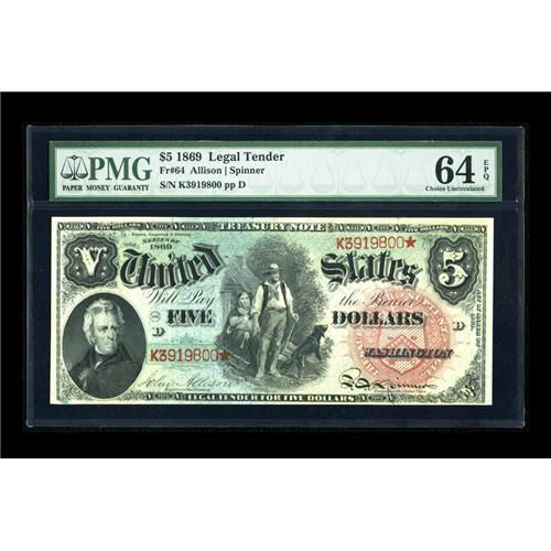 <B>Fr. 64 $5 1869 Legal Tender PMG Choice Uncirculated 64 EPQ.</B></I> Henry Gugler's "Woodchopper" design, formally known as "The Pioneers," is always a collector favorite. The rainbow colors of the 1869 issue give a presentation that is unmatched in the U.S. currency series. Certain to have garnered a higher grade with a little thicker margin at bottom right.<BR><BR><b>Shipping:</b> Coins & Currency (<a target="_blank" href="http://www.heritageauctions.com/common/shipping.php">view shipping information</a>)