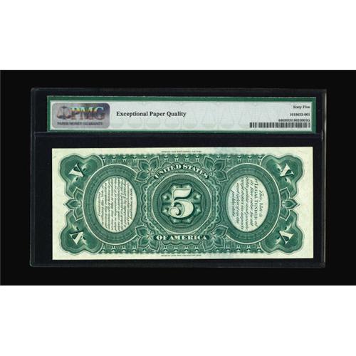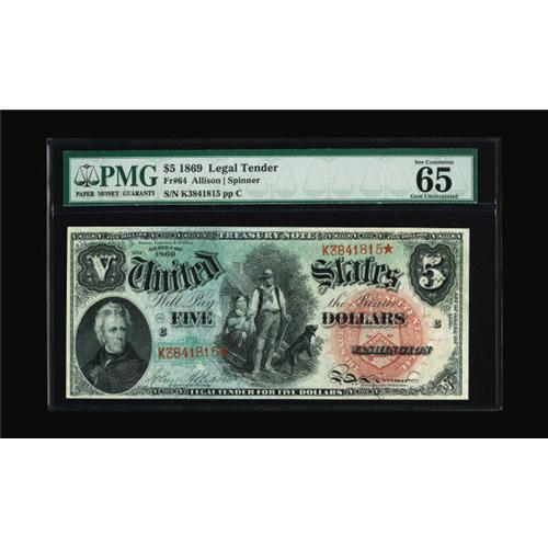 <B>Fr. 64 $5 1869 Legal Tender PMG Gem Uncirculated 65 EPQ.</B></I> This note makes its first appearance at public auction according to census records. Simply a fresh and awe inspiring example with bright inks and excellent centering.
