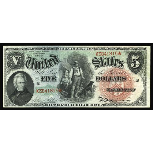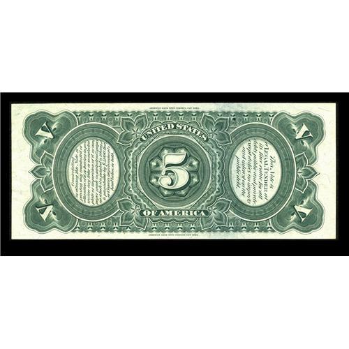 <B>Fr. 64 $5 1869 Legal Tender Very Choice New.</B></I> But for the centering, this note would be a perfect Gem. The face is centered a bit to the left and the back a bit toward the bottom right. The colors are outstanding and the note does not lack in eye appeal.