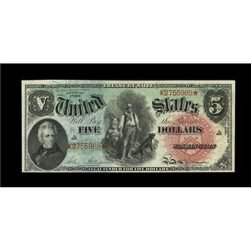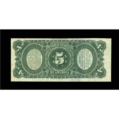 <B>Fr. 64 $5 1869 Legal Tender Very Choice New.</B></I> Held from the Gem grade by a tight top back margin, and a somewhat small bottom face margin. The colors are terrific on this Pioneer Rainbow.<BR><BR><b>Shipping:</b> Coin/Currency (<a target="_blank" href="http://www.heritageauctions.com/common/shipping.php">view shipping information</a>)