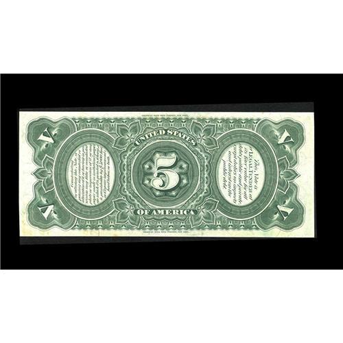 <B>Fr. 64 $5 1869 Legal Tender Very Choice New.</B></I> This is the variety with the USUSUS watermark which is commonly seen on Fourth Issue Fractionals and is much scarcer on Large Size Currency. The right end of the bottom margin comes a bit close on this boldly colored, Rainbow Pioneer Five. The surfaces are strictly original and the side and top margins are more than generous. On balance, this pretty piece comes quite close to the full Gem grade.<BR><I>From The Plymouth Rock Collection</B></I>