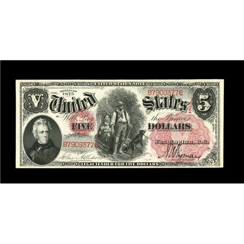 <B>Fr. 65 $5 1875 Legal Tender Extremely Fine-About New.</B></I> One less minor bend and this note would receive a full AU moniker. The margins frame a brightly colored note with bright, original paper.<BR><BR><b>Shipping:</b> Coin/Currency (<a target="_blank" href="http://www.heritageauctions.com/common/shipping.php">view shipping information</a>)