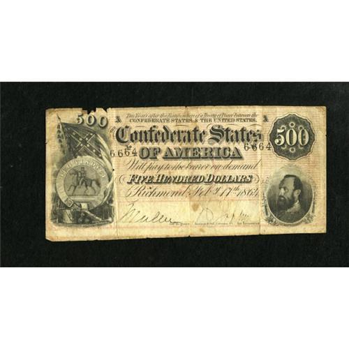 <B>T64 $500 1864.</B></I><BR> This $500 saw circulation. It has a few enlarged pinholes, edge damage, and small internal splits. <B>Good-Very Good. </B></I><BR><BR><b>Shipping:</b> Coins & Currency (<a target="_blank" href="http://www.heritageauctions.com/common/shipping.php">view shipping information</a>)