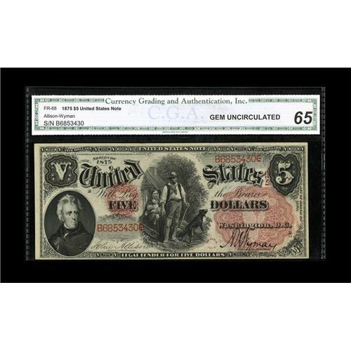 <B>Fr. 68 $5 1875 Legal Tender CGA Gem Uncirculated 65.</B></I> The centering is not quite perfect on this fresh note, but all four margins are more than ample.<BR><BR><b>Shipping:</b> Coin/Currency (<a target="_blank" href="http://www.heritageauctions.com/common/shipping.php">view shipping information</a>)