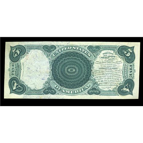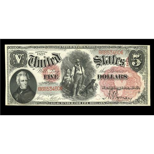 <B>Fr. 68 $5 1875 Legal Tender Gem New.</B></I> The upper right face margin strays a bit close for the Gem grade, but this totally original, beautifully fresh note is so spectacular in every other sense that we've stretched a hair on the margin. Calling a note with this eye appeal and technical merit anything less than Gem would be a fallacy.