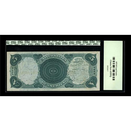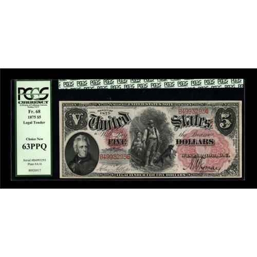 <B>Fr. 68 $5 1875 Legal Tender PCGS Choice New 63PPQ.</B></I> This well centered note displays margins normally seen on higher grade examples. This is a tougher note for type, with less than 100 examples known. Expect to see a realization closer to that of a note a point higher. Strongly embossed and bright with plenty of eye appeal, it is certain to find a happy new owner.<BR><BR><b>Shipping:</b> Coins & Currency (<a target="_blank" href="http://www.heritageauctions.com/common/shipping.php">view shipping information</a>)