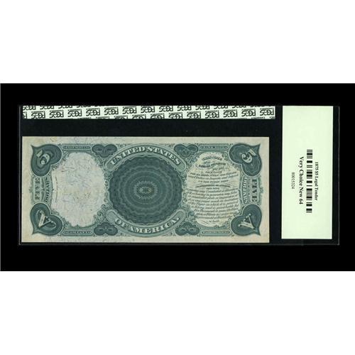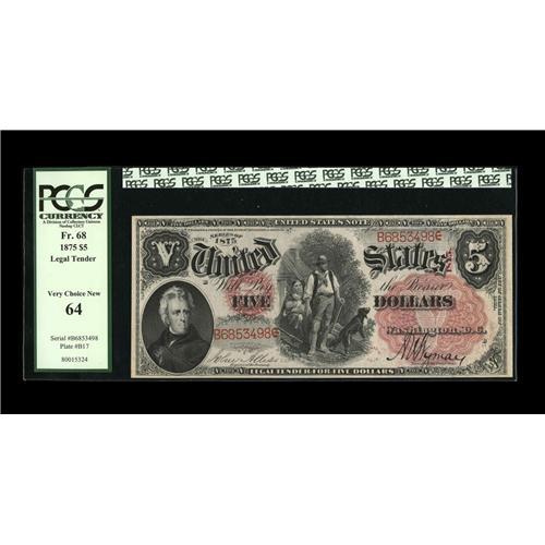 <B>Fr. 68 $5 1875 Legal Tender PCGS Very Choice New 64.</B></I> A near-Gem example, with good margins and unusually bright color for the type. The red overprint is particularly bold.