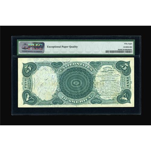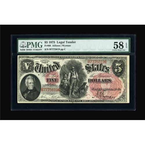 <B>Fr. 68 $5 1875 Legal Tender PMG Choice About Unc 58 EPQ.</B></I> Embossing from the heaviest parts of the face design is noted on back. The paper is appealing and original, with a couple of corner bends accounting for the grade.<BR><BR><b>Shipping:</b> Coins & Currency (<a target="_blank" href="http://www.heritageauctions.com/common/shipping.php">view shipping information</a>)