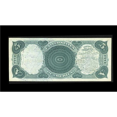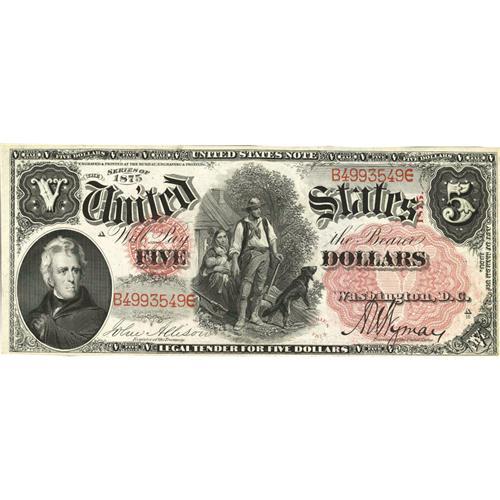 <B>Fr. 68 $5 1875 Legal Tender Superb Gem New.</B></I> Less than 90 examples are known for this design type. Along with its terrific paper originality, it has broad, even margins, perfect back centering and excellent eye appeal.<BR><I>From The Plymouth Rock Collection</B></I>