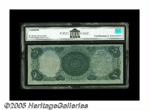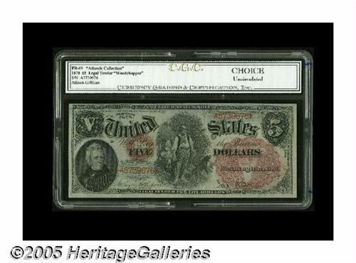 <B>Fr. 69 $5 1878 Legal Tender CGC Choice Uncirculated.</B></I> This note is listed on the CGC holder as being from the "Atlantic Collection." The CGC holder lists the grade as "Choice Uncirculated" only, without a numerical designation. The note is quite bright, and it is the variety with the blue anti-counterfeiting stain running horizontally the full length of the paper. It also has the bold USUSUS watermark. The note appears problem free save for a rather narrow top margin that comes quite close to the frame line towards its left end.
