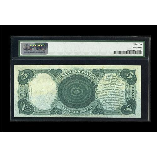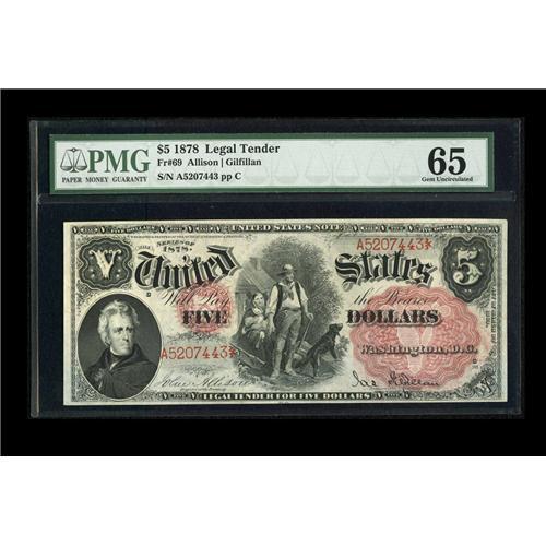 <B>Fr. 69 $5 1878 Legal Tender PMG Gem Uncirculated 65.</B></I> Another Gem is offered in our sale this evening which is brightly inked with decent back centering. This note is from a small run which has supplied collectors with a sparse supply of new notes.