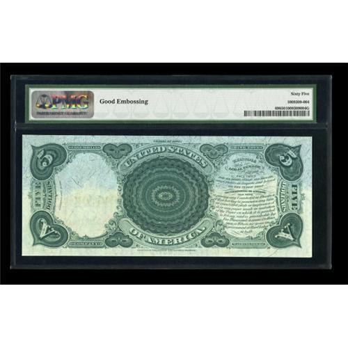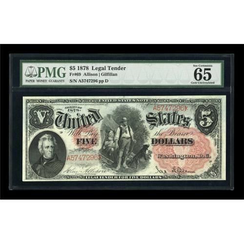 <B>Fr. 69 $5 1878 Legal Tender PMG Gem Uncirculated 65.</B></I> There are several different paper varieties of Fr. 69. This is the one with the heavy blue anticounterfeiting stain running horizontally across the top of the note. It also has the linked repetitive USUSUS watermark that was used on many of the Fourth Issue Fractional notes printed during the same time period. This note is an early PMG-graded piece, and although it does not have the EPQ comment, it does have "Good Embossing," and may well now qualify for EPQ were it regraded.<BR><BR><b>Shipping:</b> Coins & Currency (<a target="_blank" href="http://www.heritageauctions.com/common/shipping.php">view shipping information</a>)