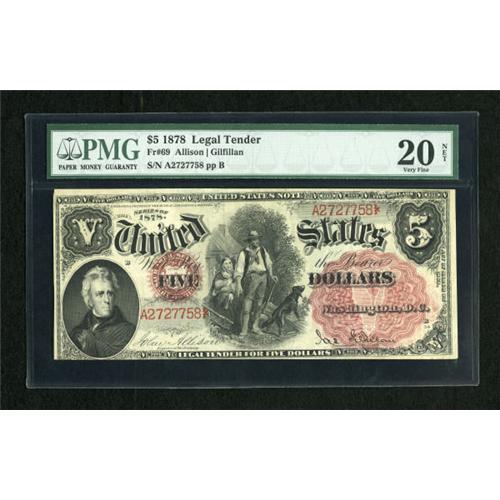 <B>Fr. 69 $5 1878 Legal Tender PMG Very Fine 20 Net.</B></I> This boldly colored piece has all the eye appeal of a full EF. The note was net graded for a couple of repaired splits in the top margin. The repairs do not distract from the overall appearance.<BR><BR><b>Shipping:</b> Coins & Currency (<a target="_blank" href="http://www.heritageauctions.com/common/shipping.php">view shipping information</a>)