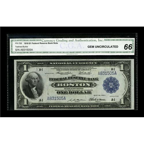 <B>Fr. 708 $1 1918 Federal Reserve Bank Note CGA Gem Uncirculated 66.</B></I> This is a well centered Gem with a distinctively bold appearance.<BR><BR><b>Shipping:</b> Coin/Currency (<a target="_blank" href="http://www.heritageauctions.com/common/shipping.php">view shipping information</a>)