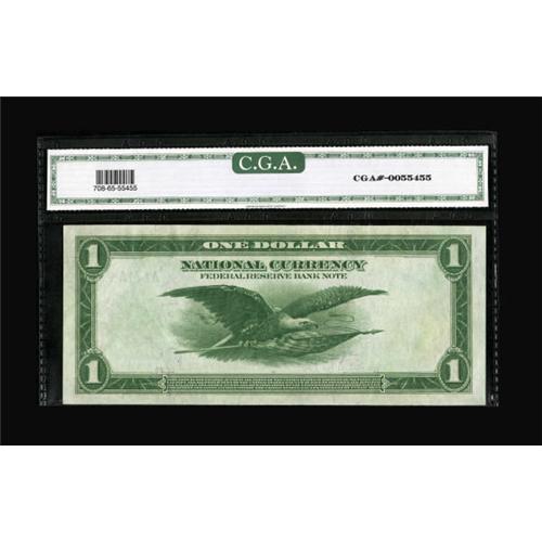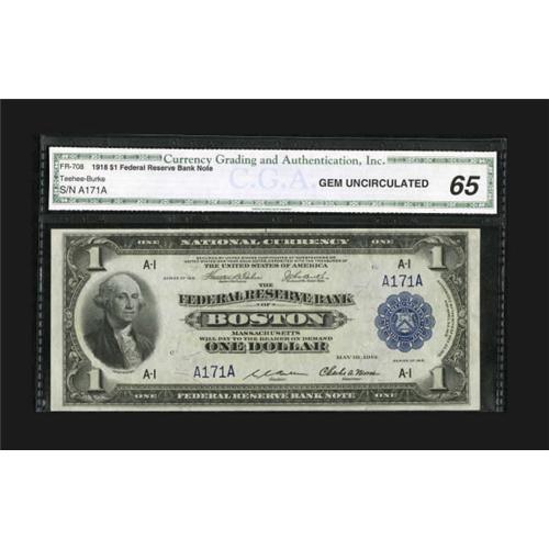 <B>Fr. 708 $1 1918 Federal Reserve Bank Note CGA Gem Uncirculated 65.</B></I> The three digit serial number A171A also happens to be a radar. Embossing of the serial numbers and seal is clearly evident when one views the back of the note.<BR><BR><b>Shipping:</b> Coins & Currency (<a target="_blank" href="http://www.heritageauctions.com/common/shipping.php">view shipping information</a>)