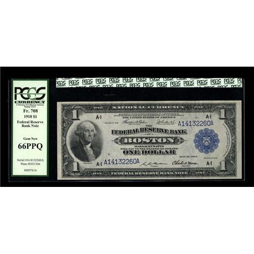 <B>Fr. 708 $1 1918 Federal Reserve Bank Note PCGS Gem New 66PPQ.</B></I> A handsome note with broad margins and pronounced paper originality.<BR><BR><b>Shipping:</b> Coins & Currency (<a target="_blank" href="http://www.heritageauctions.com/common/shipping.php">view shipping information</a>)