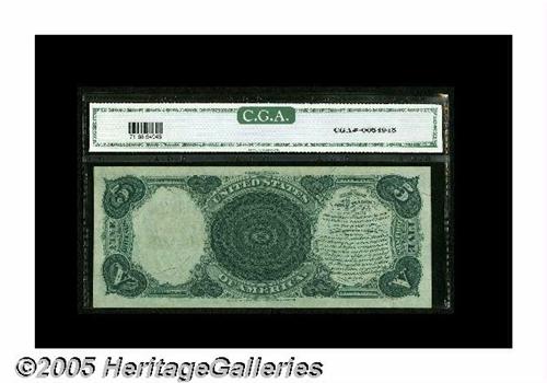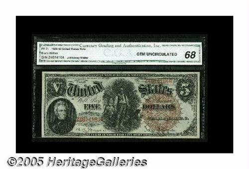 <B>Fr. 71 $5 1880 Legal Tender CGA Gem Uncirculated 68.</B></I> A hugely margined example of this Pioneer Family type with the large brown spiked seal. The centering is perfect on both sides, and the deep, original embossing is easily seen through the third-party holder.