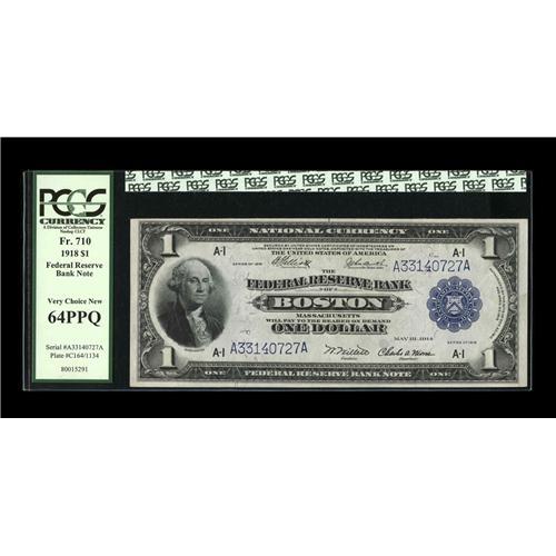 <B>Fr. 710 $1 1918 Federal Reserve Bank Note PCGS Very Choice New 64PPQ.</B></I> A note with all the eye appeal one would expect.</B></I>