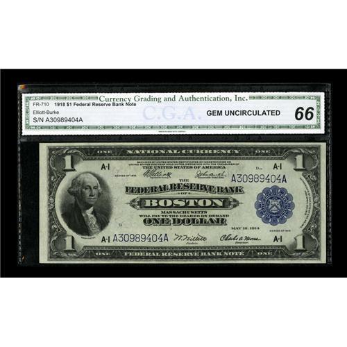 <B>Fr. 710 $1 1918 Federal Reserve Bank Note CGA Gem Uncirculated 66.</B></I> Wide margins and nice centering combine with the natural paper surfaces of this Boston Deuce.<BR><BR><b>Shipping:</b> Coins & Currency (<a target="_blank" href="http://www.heritageauctions.com/common/shipping.php">view shipping information</a>)