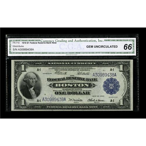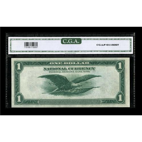 <B>Fr. 710 $1 1918 Federal Reserve Bank Note CGA Gem Uncirculated 66.</B></I> Perfectly even margins are noted all around.<BR><BR><b>Shipping:</b> Coins & Currency (<a target="_blank" href="http://www.heritageauctions.com/common/shipping.php">view shipping information</a>)