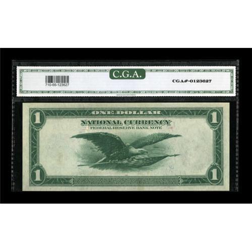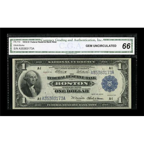 <B>Fr. 710 $1 1918 Federal Reserve Bank Note CGA Gem Uncirculated 66.</B></I> This broadly margined issue includes a large inclusion. The inclusion appears to be from the paper-making process.<BR><BR><b>Shipping:</b> Coins & Currency (<a target="_blank" href="http://www.heritageauctions.com/common/shipping.php">view shipping information</a>)