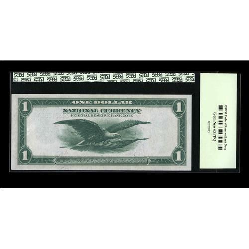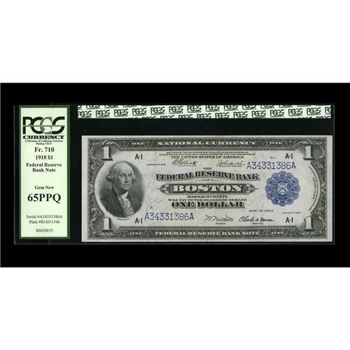 <B>Fr. 710 $1 1918 Federal Reserve Bank Note PCGS Gem New 65PPQ.</B></I> This Boston Ace FRBN screams originality with mountainous embossing pushing through the holder.