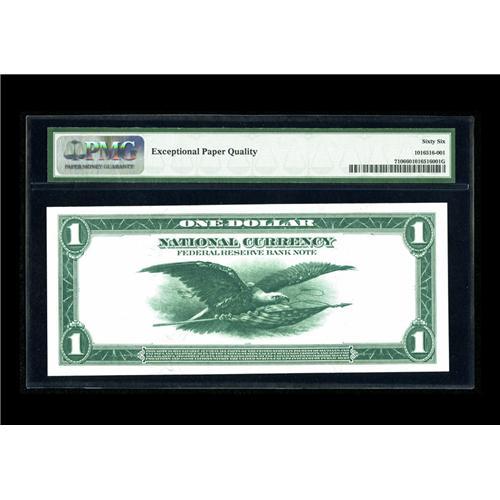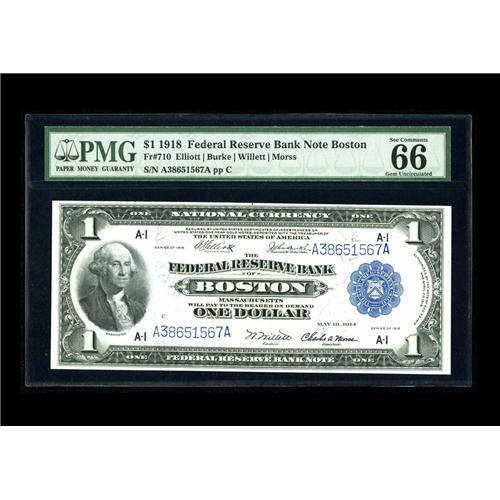 <B>Fr. 710 $1 1918 Federal Reserve Bank Note PMG Gem Uncirculated 66 EPQ.</B></I> Nice even margins are noted as well as decent front to back centering. The paper is bright and original. Just over a year ago we sold a PCGS Gem New 65 for nearly $700, which leads us to believe this note is worth. . .<BR><BR><b>Shipping:</b> Coin/Currency (<a target="_blank" href="http://www.heritageauctions.com/common/shipping.php">view shipping information</a>)