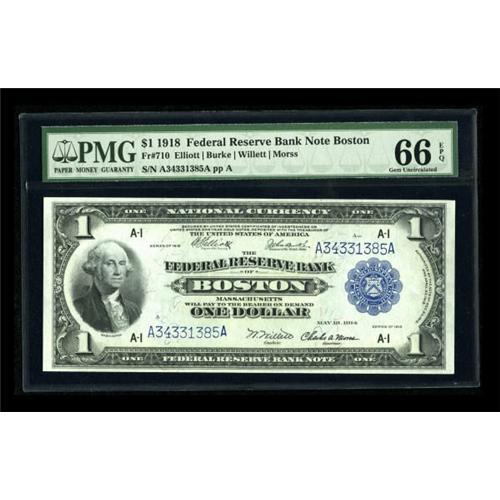 <B>Fr. 710 $1 1918 Federal Reserve Bank Note PMG Gem Uncirculated 66 EPQ.</B></I> Solid margins are noted on this Boston Ace.<BR><BR><b>Shipping:</b> Coins & Currency (<a target="_blank" href="http://www.heritageauctions.com/common/shipping.php">view shipping information</a>)