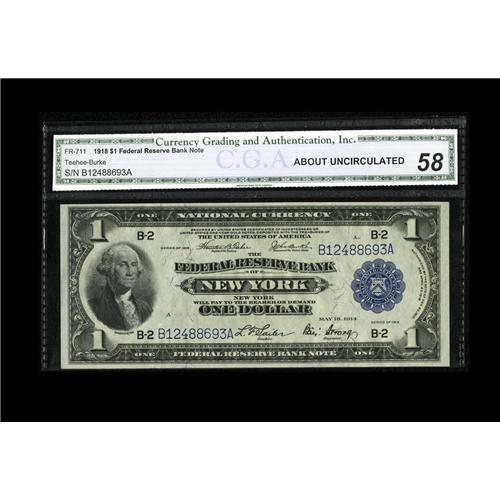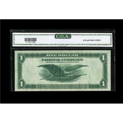 <B>Fr. 711 $1 1918 Federal Reserve Bank Note CGA About Uncirculated 58.</B></I> A center crinkle and corner fold may account for the grade, though it must be reported that the embossing is bold and clearly visible through the holder.
