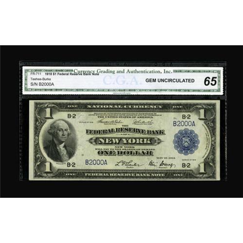 <B>Fr. 711 $1 1918 Federal Reserve Bank Note CGA Gem Uncirculated 65.</B></I> Embossing of the four digit serial number is plainly evident on the back of the note. The serial number is B2000A.<BR><BR><b>Shipping:</b> Coins & Currency (<a target="_blank" href="http://www.heritageauctions.com/common/shipping.php">view shipping information</a>)