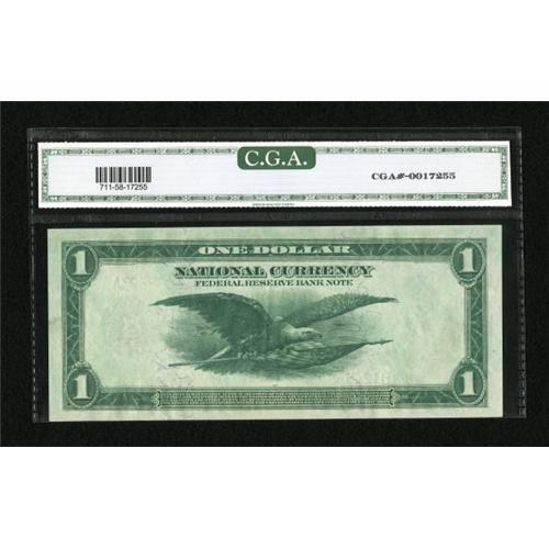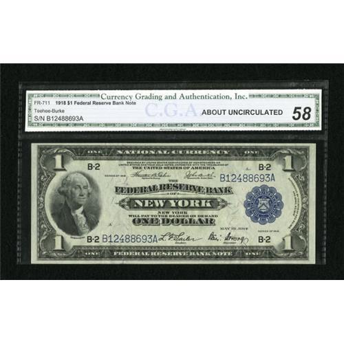 <B>Fr. 711 $1 1918 Federal Reserve Bank Note CGA About Uncirculated 58.</B></I> A broad corner fold and crimp in the middle are noted on this otherwise attractive and fully uncirculated issue.<BR><BR><b>Shipping:</b> Coins & Currency (<a target="_blank" href="http://www.heritageauctions.com/common/shipping.php">view shipping information</a>)