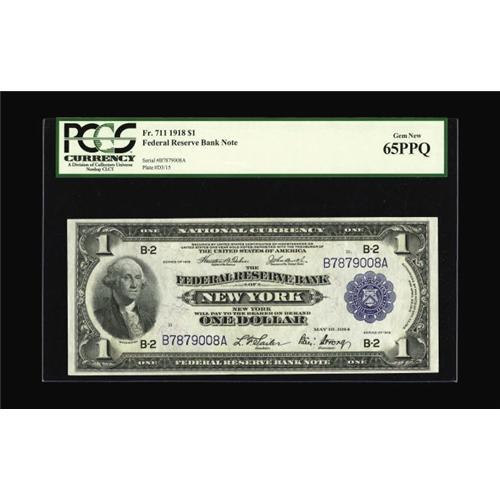 <B>Fr. 711 $1 1918 Federal Reserve Bank Note PCGS Gem New 65PPQ.</B></I> This clearly original FRBN is surrounded by solid margins all the way around.