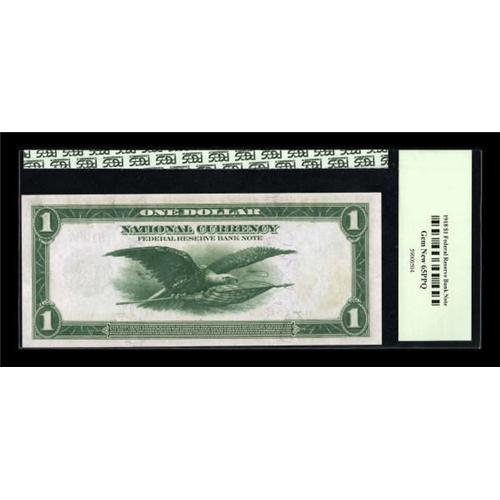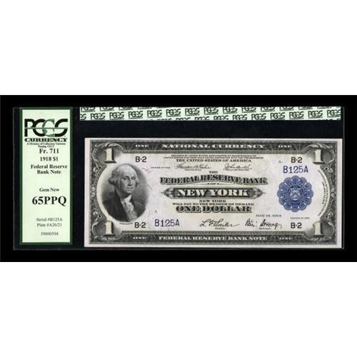 <B>Fr. 711 $1 1918 Federal Reserve Bank Note PCGS Gem New 65PPQ.</B></I> Solid margins surround this triple digit Ace. Embossing of the serial number B125A is plainly evident on the back of the note.<BR><BR><b>Shipping:</b> Coins & Currency (<a target="_blank" href="http://www.heritageauctions.com/common/shipping.php">view shipping information</a>)