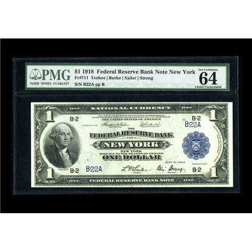 <B>Fr. 711 $1 1918 Federal Reserve Bank Note PMG Choice Uncirculated 64EPQ.</B></I> Serial number 22 is found on this Ace from the second FRB district. We also have a serial number 22 Dallas $1 FRBN in this auction.<BR><BR><b>Shipping:</b> Coin/Currency (<a target="_blank" href="http://www.heritageauctions.com/common/shipping.php">view shipping information</a>)