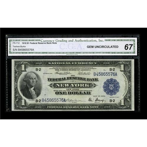 <B>Fr. 712 $1 1918 Federal Reserve Bank Note CGA Gem Uncirculated 67.</B></I> A touch of teller handling is noted on this bright white issue.<BR><BR><b>Shipping:</b> Coins & Currency (<a target="_blank" href="http://www.heritageauctions.com/common/shipping.php">view shipping information</a>)
