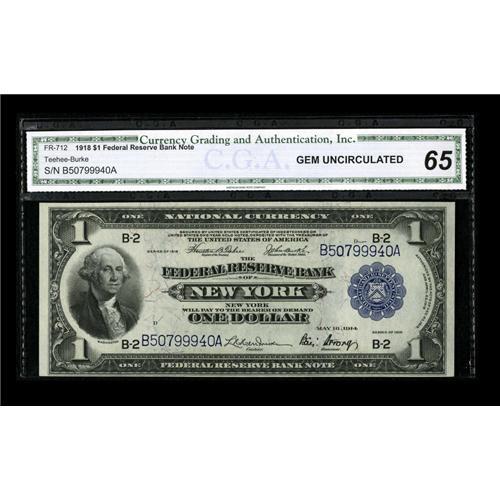 <B>Fr. 712 $1 1918 Federal Reserve Bank Note CGA Gem Uncirculated 65.</B></I> The finely detailed design is deeply printed and boasts a bold blue overprint.<BR><BR><b>Shipping:</b> Coins & Currency (<a target="_blank" href="http://www.heritageauctions.com/common/shipping.php">view shipping information</a>)