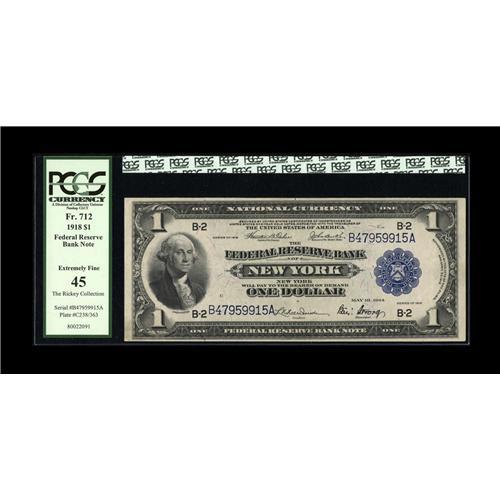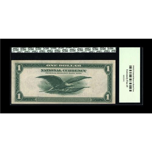 <B>Fr. 712 $1 1918 Federal Reserve Bank Note PCGS Extremely Fine 45.</B></I> When viewed with intent, a couple of folds come to light, though the note appears Uncirculated overall.<BR><I>Ex: Rickey Collection</B></I>