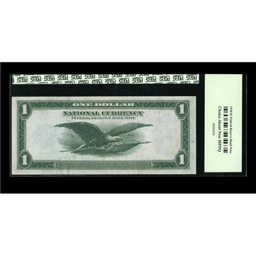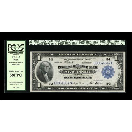 <B>Fr. 713 $1 1918 Federal Reserve Bank Note PCGS Choice About New 58PPQ.</B></I> This Big Apple FRBN displays vibrant overprints and creamy white surfaces.