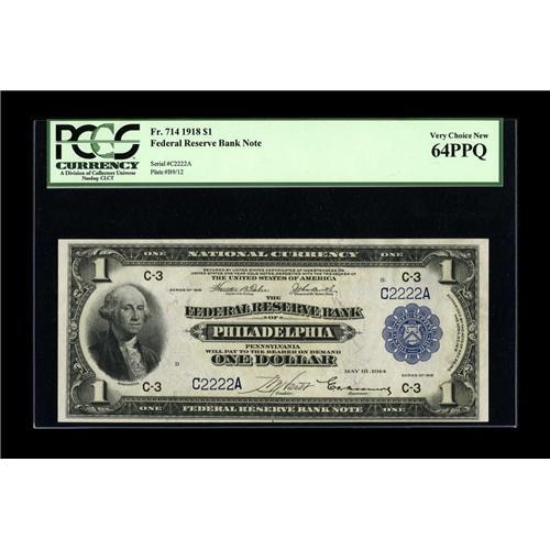 <B>Fr. 714 $1 1918 Federal Reserve Bank Note PCGS Very Choice New 64PPQ.</B></I> This solid serial number C2222A last appeared at public auction in 1993 and realized $160. Though the bottom margin is a touch tight, the rest of the note is particularly appealing, including the embossing, and original paper quality.<BR><I>From The Bill and Kathy Stella Currency Collection</B></I><BR><BR><b>Shipping:</b> Coin/Currency (<a target="_blank" href="http://www.heritageauctions.com/common/shipping.php">view shipping information</a>)