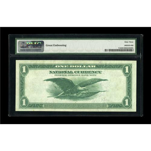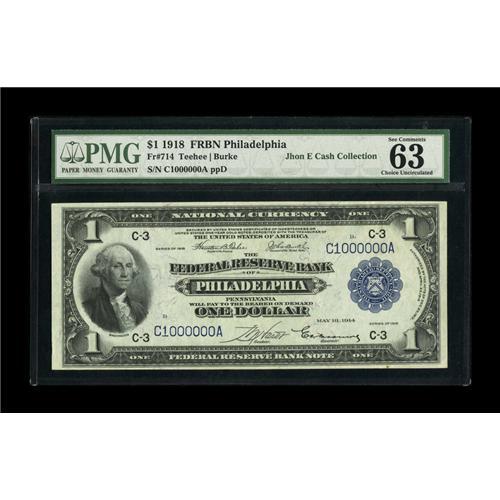 <B>Fr. 714 $1 1918 Federal Reserve Bank Note PMG Choice Uncirculated 63.</B></I> This Philadelphia FRBN Ace has the neat solid serial number C1000000A. It is a very pretty note that carries the PMG comment, "Great Embossing." Two and three-digit special serial number notes are not that hard to locate from this series, but special number of this ilk are very hard to come by.<BR><BR><b>Shipping:</b> Coins & Currency (<a target="_blank" href="http://www.heritageauctions.com/common/shipping.php">view shipping information</a>)