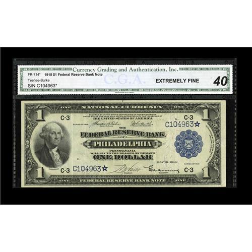 <B>Fr. 714 $1 1918 Federal Reserve Bank Note Star CGA Extremely Fine 40.</B></I> A new note to the Star census, bringing the total known pieces up to seven. This is the highest recorded serial number, and the only one to reach into six digits.
