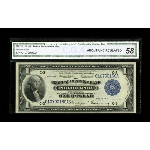 <B>Fr. 715 $1 1918 Federal Reserve Bank Note CGA About Uncirculated 58.</B></I> Some embossing remains on this Philadelphia Ace.<BR><BR><b>Shipping:</b> Coin/Currency (<a target="_blank" href="http://www.heritageauctions.com/common/shipping.php">view shipping information</a>)