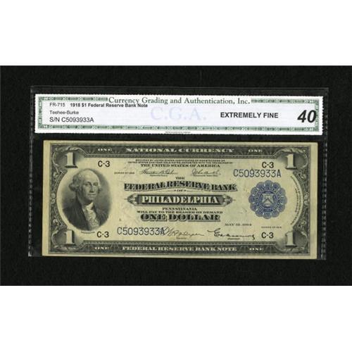 <B>Fr. 715 $1 1918 Federal Reserve Bank Note CGA Extremely Fine 40.</B></I> A decent looking FRBN Ace that has lightly toned paper.<BR><BR><b>Shipping:</b> Coins & Currency (<a target="_blank" href="http://www.heritageauctions.com/common/shipping.php">view shipping information</a>)