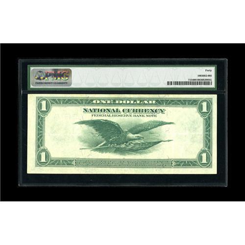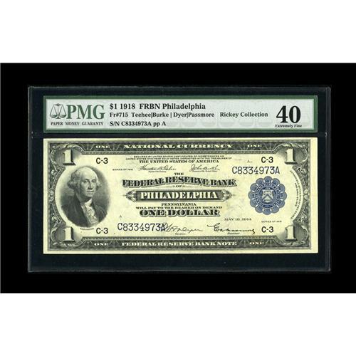 <B>Fr. 715 $1 1918 Federal Reserve Bank Note PMG Extremely Fine 40.</B></I> A horizontal and vertical fold are noted, even fold counters may consider the presence of only two folds to be a full About New. Well margined and deeply printed.<BR><I>Ex: Rickey Collection</B></I>