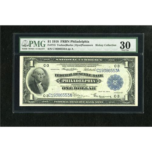<B>Fr. 715 $1 1918 Federal Reserve Bank Note PMG Very Fine 30.</B></I> This Philly Ace is well margined with nice surfaces.<BR><I>From The Collection of Greg Southward</B></I><BR><BR><b>Shipping:</b> Coins & Currency (<a target="_blank" href="http://www.heritageauctions.com/common/shipping.php">view shipping information</a>)