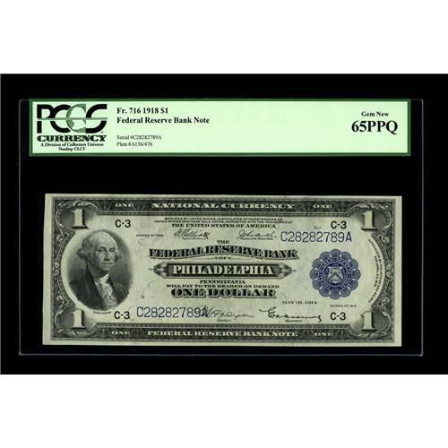 <B>Fr. 716 $1 1918 Federal Reserve Bank Note PCGS Gem New 65PPQ.</B></I> The second of just two PCGS graded Gem new 65PPQ examples in this group. We note auction records from last year well in excess of our likely conservative estimate for non-certified uncirculated examples of this very scarce Friedberg number.<BR><BR><b>Shipping:</b> Coin/Currency (<a target="_blank" href="http://www.heritageauctions.com/common/shipping.php">view shipping information</a>)