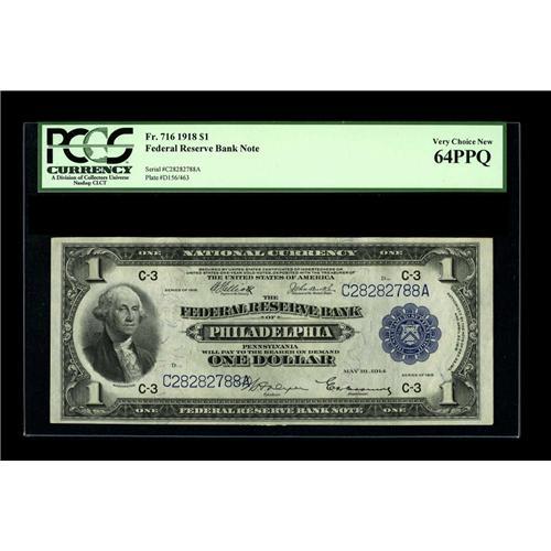 <B>Fr. 716 $1 1918 Federal Reserve Bank Note PCGS Very Choice New 64PPQ.</B></I> Another 64PPQ example of this very scarce Friedberg number.<BR><BR><b>Shipping:</b> Coin/Currency (<a target="_blank" href="http://www.heritageauctions.com/common/shipping.php">view shipping information</a>)