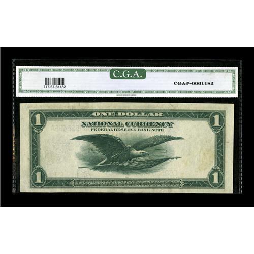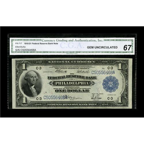<B>Fr. 717 $1 1918 Federal Reserve Bank Note CGA Gem Uncirculated 67.</B></I> A beautifully margined example with original embossing deep enough to be seen through the third-party holder. We haven't seen very many examples of this type that CGA has assigned such a high grade.<BR><BR><b>Shipping:</b> Coin/Currency (<a target="_blank" href="http://www.heritageauctions.com/common/shipping.php">view shipping information</a>)