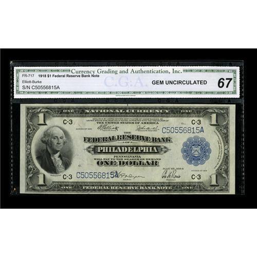 <B>Fr. 717 $1 1918 Federal Reserve Bank Note CGA Gem Uncirculated 67.</B></I> Pleasing paper waves and bold embossing are noted on this bright white piece.<BR><BR><b>Shipping:</b> Coins & Currency (<a target="_blank" href="http://www.heritageauctions.com/common/shipping.php">view shipping information</a>)