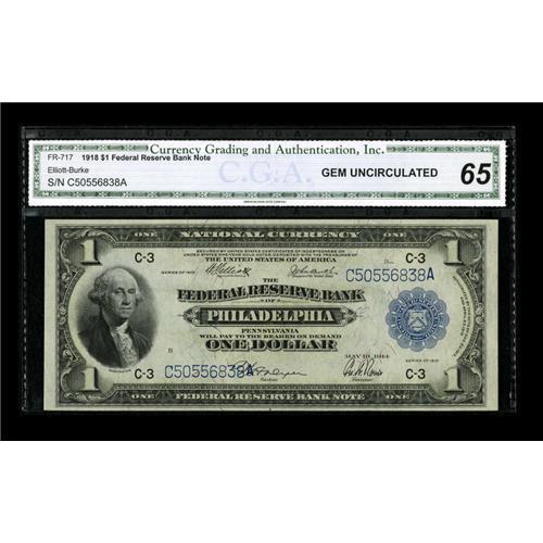 <B>Fr. 717 $1 1918 Federal Reserve Bank Note CGA Gem Uncirculated 65.</B></I> Some as made paper crinkles are noted on the right hand side of this note, but they fail to interrupt the design or aesthetic continuity.<BR><BR><b>Shipping:</b> Coins & Currency (<a target="_blank" href="http://www.heritageauctions.com/common/shipping.php">view shipping information</a>)